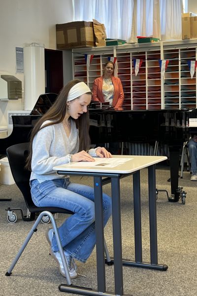 Nach einem den SchülerInnen bekannten und sehr gut vorbereiteten Romanauszug in Dialogform („Les révélations de Tulum“) lasen die KandidatInnen auch einen monologischen unbekannten Text („Mais qui est Emile?“) vor und bewiesen dabei bereits nach nur eineinhalb Jahren Fremdsprachenunterricht ein bemerkenswertes Gespür für gute Ausprache, Betonung und lebendige Interpretation französischer Texte. In den Pausen durften wir uns über abwechslungsreiche musikalische Unterhaltung freuen: Felix Dickmeis und Martin Chmielewski erfreuten uns mit ihrem Können an Saxophon und Klavier.