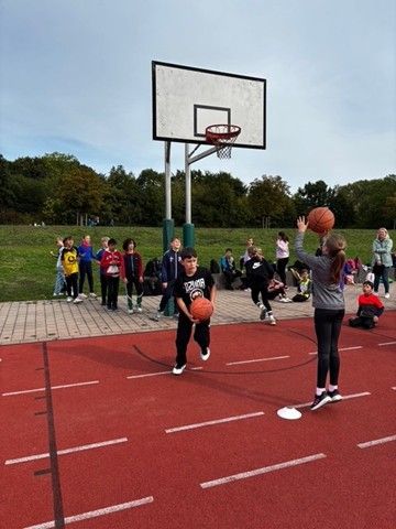 In ihrer Klasse traten die Kinder in verschiedenen Disziplinen gegeneinander an – darunter beliebte Klassiker wie Völkerball und Basketball, aber auch kreative Spiele wie Zeitfangen, Würfelstaffel, Kronkorkenwurf und das actionreiche Tandem-Pedalorennen. An jeder Station standen Fairness, Spaß und gegenseitige Unterstützung im Vordergrund. Immer wieder hallte lauter Jubel über den Sportplatz, wenn die Teams sich gegenseitig anfeuerten und Erfolge feierten.