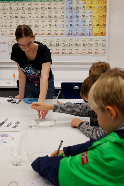 Das Angebot reichte von Experimenten und Aktionen bis hin zu Knobel- und Quizaufgaben. Die Chemiefachschaft beeindruckte erneut mit einer eindrucksvollen Chemieshow, während Lateinlehrkräfte mit einer klassischen Probe-Unterrichtsstunde großen Zuspruch fanden. Im Angebot der Roboter-AG erfuhren die Kinder, wie Lego-Technik zu funktionierenden Robotern wird, und durften die kleinen Maschinen selbst per Tablet durch einen Parcours steuern. Medienkoordinator Sebastian Krieter und die Medienscouts stellten außerdem moderne Einsatzmöglichkeiten digitaler Medien wie MacBooks, iPads und spezielle Softwarelösungen vor.