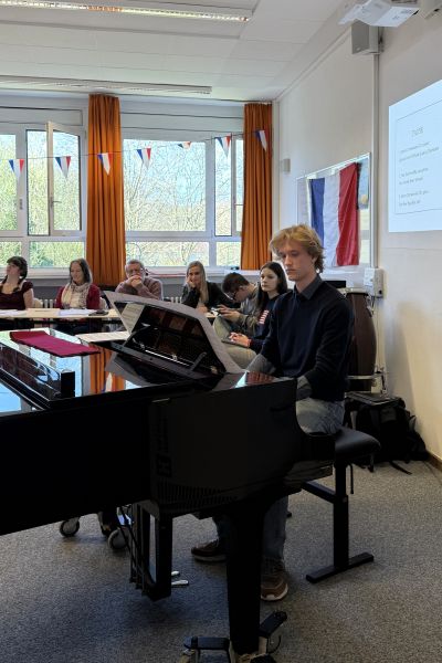 Nach einem den SchülerInnen bekannten und sehr gut vorbereiteten Romanauszug in Dialogform („Les révélations de Tulum“) lasen die KandidatInnen auch einen monologischen unbekannten Text („Mais qui est Emile?“) vor und bewiesen dabei bereits nach nur eineinhalb Jahren Fremdsprachenunterricht ein bemerkenswertes Gespür für gute Ausprache, Betonung und lebendige Interpretation französischer Texte. In den Pausen durften wir uns über abwechslungsreiche musikalische Unterhaltung freuen: Felix Dickmeis und Martin Chmielewski erfreuten uns mit ihrem Können an Saxophon und Klavier.