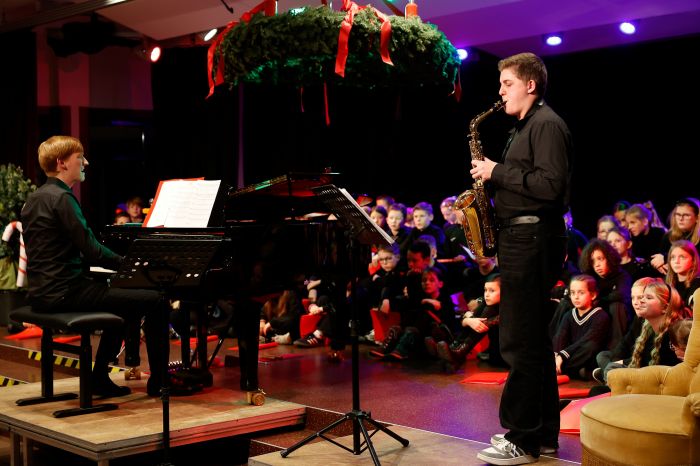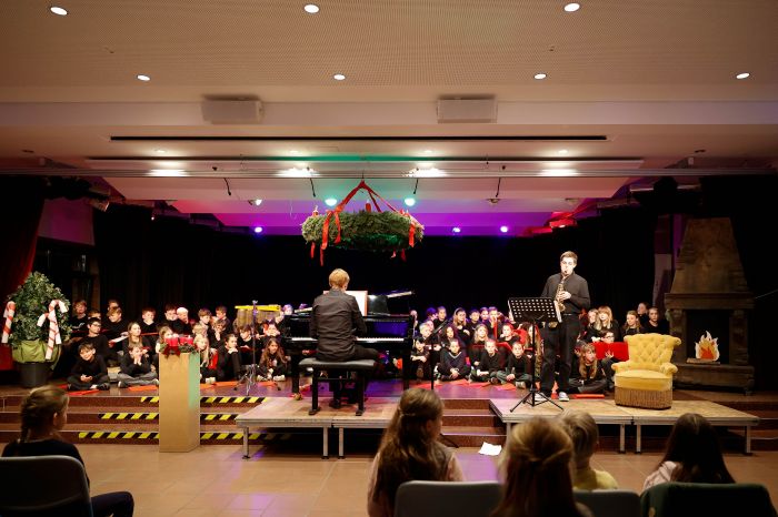 Die Ohrwürmer bewiesen ihre musikalische Bandbreite, indem sie sowohl das tänzerische Lied „Winter, heut‘ hab ich dich tanzen gesehn’n“ als auch das Stück „Die Sterne am Himmel träumen“ stimmungsvoll interpretierten. Abgerundet wurde das musikalische Programm durch Gedichte und Kurzgeschichten, die verschiedene Chormitglieder vortrugen. Neben dem Chor beeindruckte der Solist Felix Dickmeis aus der Jahrgangsstufe 9 das Publikum mit zwei weihnachtlichen Saxophonstücken, die er, begleitet von Klavierklängen, gefühlvoll vortrug.